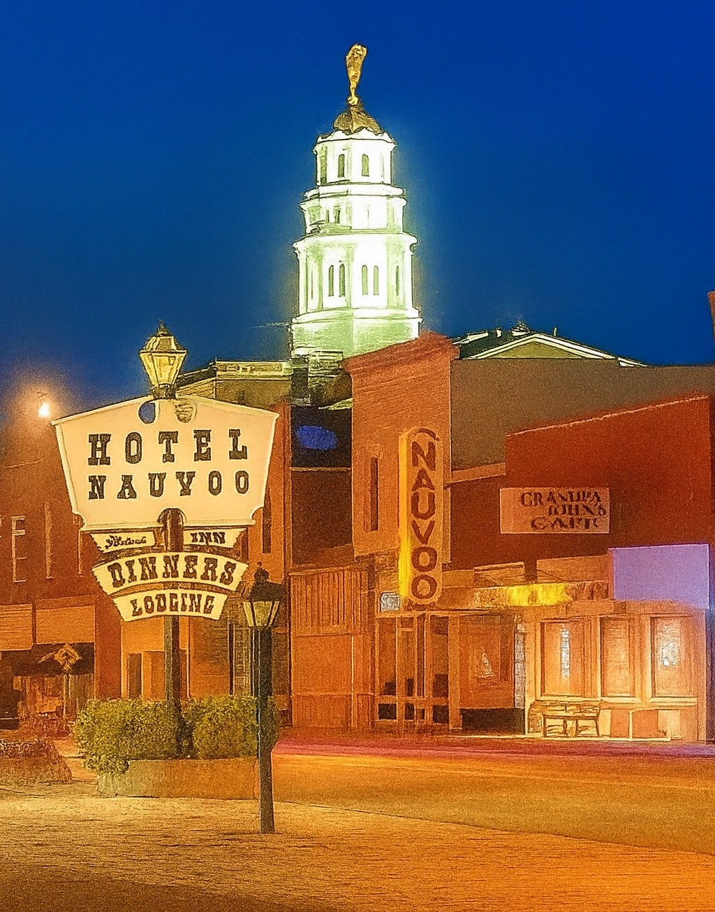 When traveling to Nauvoo from the south, Illinois Highway 96, also known as “The Great River Road”, winds north along the east banks of the Mississippi River, and then climbs a great bluff, becoming Nauvoo’s “Mulholland Street”, which continues through Nauvoo. Atop that great bluff, aside from its natural beauty, is perhaps the most striking image to greet travelers; the recently-reconstructed Nauvoo Temple of the Church of Jesus Christ of Latter Day Saints (LDS). The Temple is a massive structure, and a replica of the original Temple which was built on the same site in the 1800’s. The surrounding area of Mulholland Street (Illinois Highway 96), is often referred to as the “heart” of Nauvoo’s business district.