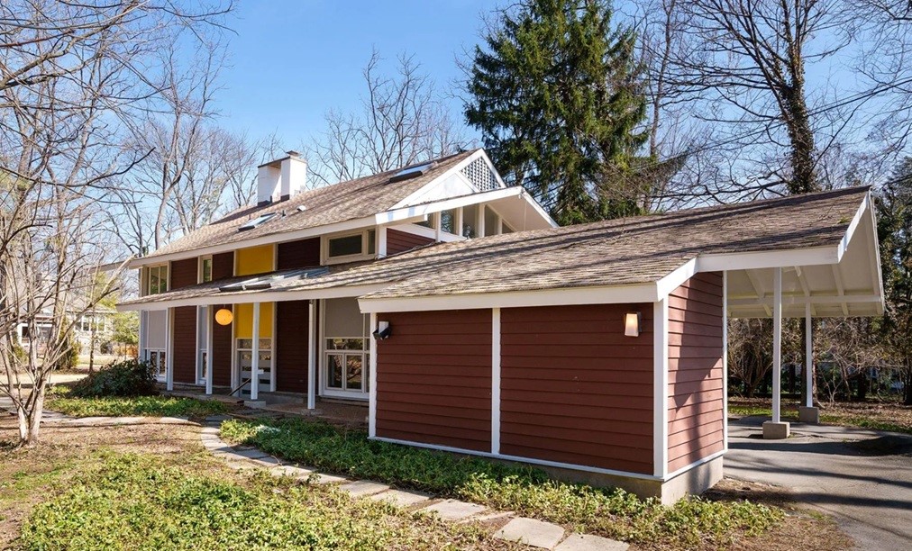 Hidden away on more than half an acre along one of Princeton’s most coveted streets, just seconds from Riverside School and Carnegie Lake, this architecturally distinct mid-century modern home offers privacy and potential. An oversized carport with a peaked roof presents a striking first impression and a sheltered welcome. The centerpiece of the interior is the dramatic living room, where one wall rises in soaring glass and the other is anchored by a double-sided fireplace shared with the den. A powder room serves guests near the nicely sized kitchen, which flows out to a stone-floor screened porch. The main-level primary wing includes a quiet study, while the upper floor hosts a second suite, two additional bedrooms and a hall bath, all washed in sunlight passing through clerestory windows. Wood floors and fresh white paint run throughout most of the interior. A shed and basement storage lend practicality. While the house is ready for thoughtful updates, the lot and location alone make this a rare opportunity.